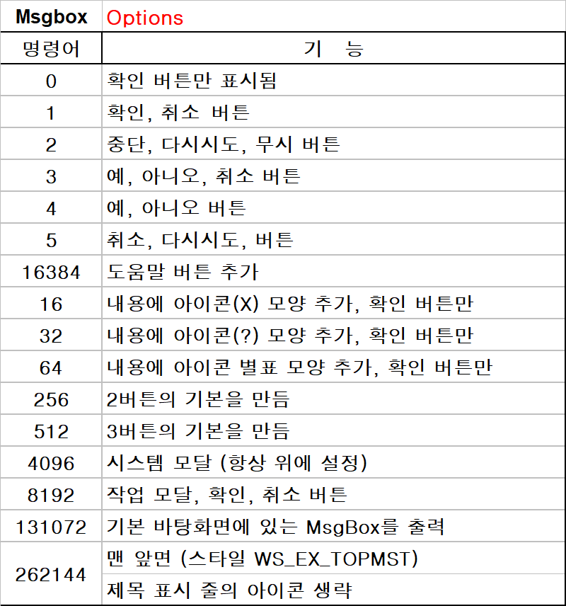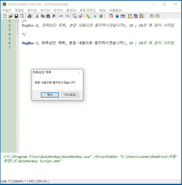 ex) MsgBox 4, 좌측상단 제목, 본문 내용으로 중지하시겟습니까?, 10 ; 10초 후 창이 사라짐